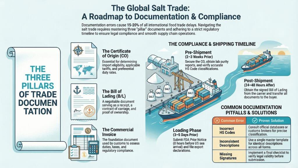 Successful salt export documentation requires understanding core documents, regulatory requirements, preparation timelines, and digital solutions. Certificate of Origin proves product nationality, Bill of Lading provides title and contract functions, and Commercial Invoice enables customs assessment. Health certificates, quality reports, and packing lists complete the documentation framework for compliant international trade.